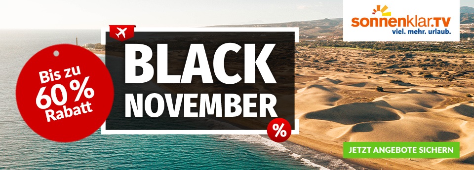 Ab dem 1. November bis zum 2. Dezember bietet Sonnenklar.TV täglich wechselnde Black-Deal Reisen mit bis zu 60 % Rabatt!