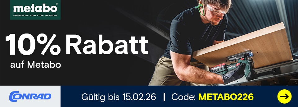HINWEIS: Rabatt nur gültig auf Artikel der Marken Metabo und HiKOKI. Gültig bis 15.02.2026 auf conrad.de (ausgenommen Marketplace Bestellungen). Nicht mit anderen Vorteilscodes kombinierbar. 1x pro Kunde. Es kann im Einzelfall eine Begrenzung der Absatzmenge erfolgen.